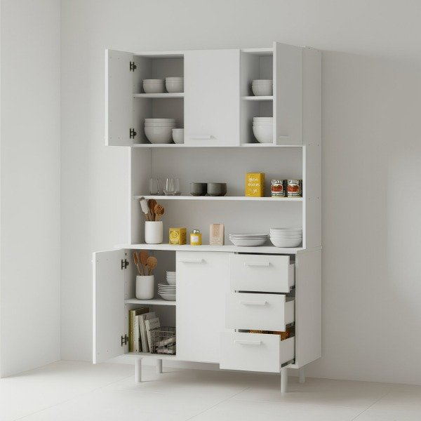 El APARADOR DE COCINA 90 es un vajillero moderno complementario a tu cocina que te permitirá almacenar platos, vasos, cubiertos y utensillos. En su zona media podes colocar electrodomésticos de uso diario como la cafetera o pava eléctrica o lo que necesites tener mas a mano. De esta forma podras liberar tu mesada para cocinar con mayor comodidad.