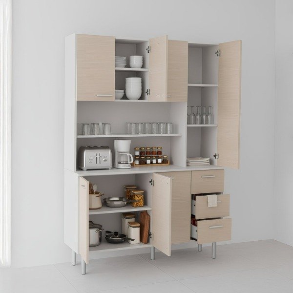 El APARADOR DE COCINA 120 es un vajillero moderno complementario a tu cocina que te permitirá almacenar platos, vasos, cubiertos y utensillos. En su zona media podes colocar electrodomésticos de uso diario como la cafetera o pava eléctrica o lo que necesites tener mas a mano. De esta forma podras liberar tu mesada para cocinar con mayor comodidad.