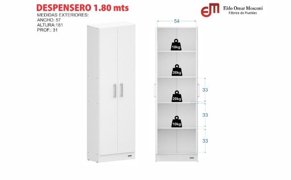 El Despensero 1,80 Mts. es un producto con gran capacidad de almacenamiento pensado para integrar tanto una cocina como también un lavadero. Presenta 5 estantes, de los cuales 2 son regulables permitiéndote posicionarlos de acuerdo a tu necesidad.