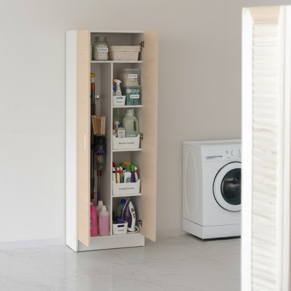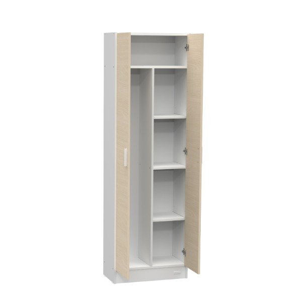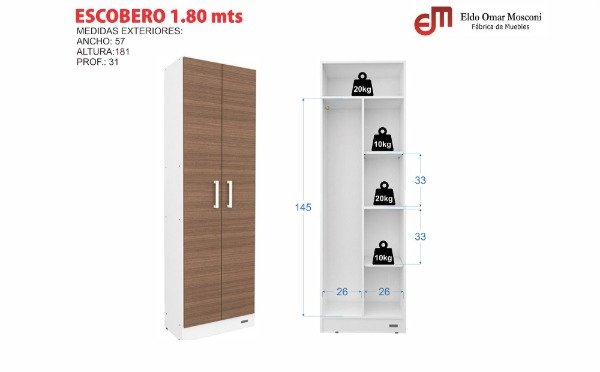 El ESCOBERO 180 es un mueble organizador de los elementos de limpieza, evitando que queden a la vista tanto escobas como escobillones, e inclusive la palita. Cuenta ademas con una columna de estantes para almacenar otros elementos mas pequeños