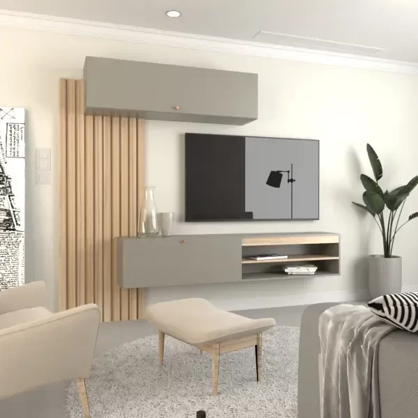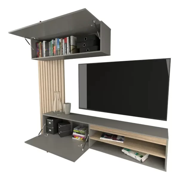 El Rack 1113 tiene dos puertas con sistema Minifix y pistones a gas, dos estantes y fabricado en melamina de alta resistencia.